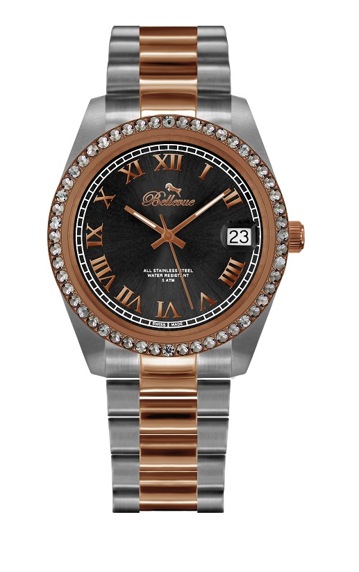 Кварцевый механизм RONDA, корпус и браслет из нержавеющей стали с IP покрытием, диаметр 36 мм, инкрустация кристаллами, минеральное стекло, WR 30 м.